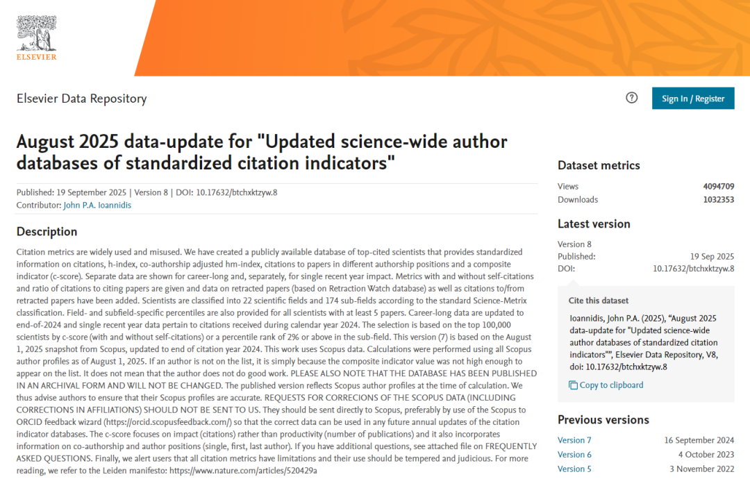 标准化引文指标全科学作者数据库由Elsevier与美国斯坦福大学共同推出,构建了涵盖全球科学界22个领域、174个子领域的前2%的科学家的公开数据。该数据库以全球最大的文摘和引文数据库—Scopus数据库为依据,计算截至 2025 年 8 月 1 日的所有 Scopus 作者资料。该数据基于引用次数(Citations)、H指数(H-index)、同行合作调整后的HM指数(Co-authorship adjusted HM-index)、不同作者单位论文的引用量(Citations to papers in different authorship positions)和一个综合指标(Composite indicator)等6项指标、共47个参数,为全球排名前2%的科学家进行大数据排名。职业长期影响力(Career-long impact)榜单统计了科学家职业生涯期间的综合影响表现;年度影响力(Single year impact)榜单则更集中于科学家上一年度的学术影响。